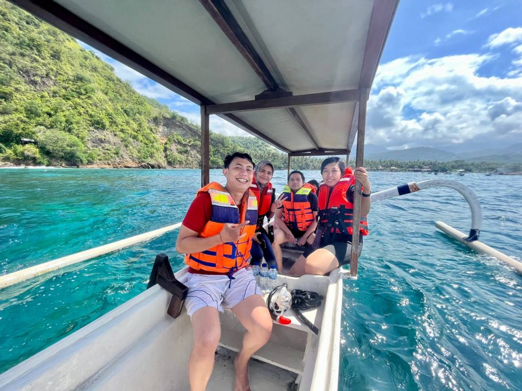 Kami bertemu dengan tour guide yang menyediakan kapal dan alat-alat snorkeling lainnya. Setelah berkeluh kesah dengan kondisi ombak, Bli Ketut meyakinkan kami bahwa akan aman di tengah sana, ombaknya tidak akan terasa.