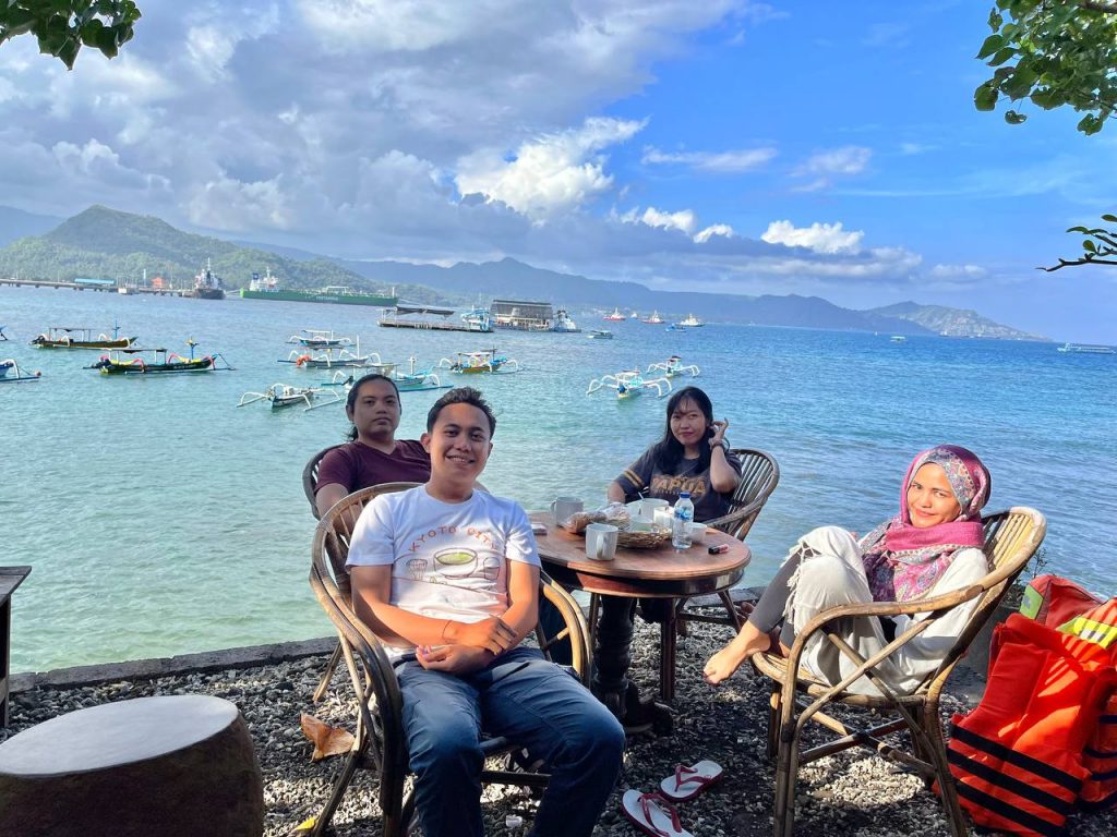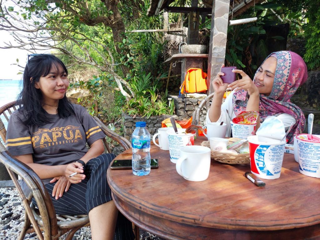 Sambil menggigil mencari pakaian ganti si Mbok menawarkan kami, “mau dibuatkan apa, pop mie, teh atau kopi?” Paket snorkeling di sini sudah termasuk cemilan yang mereka sediakan. Setelah mengganti pakaian, kami duduk santai di tepi laut. Makan pop mie dan seruput kopi. Canda tawa penambah makna. Setelah 1,5 jam duduk santai menikmati angin laut (alias kedinginan woyy), kami pulang dengan bahagia.